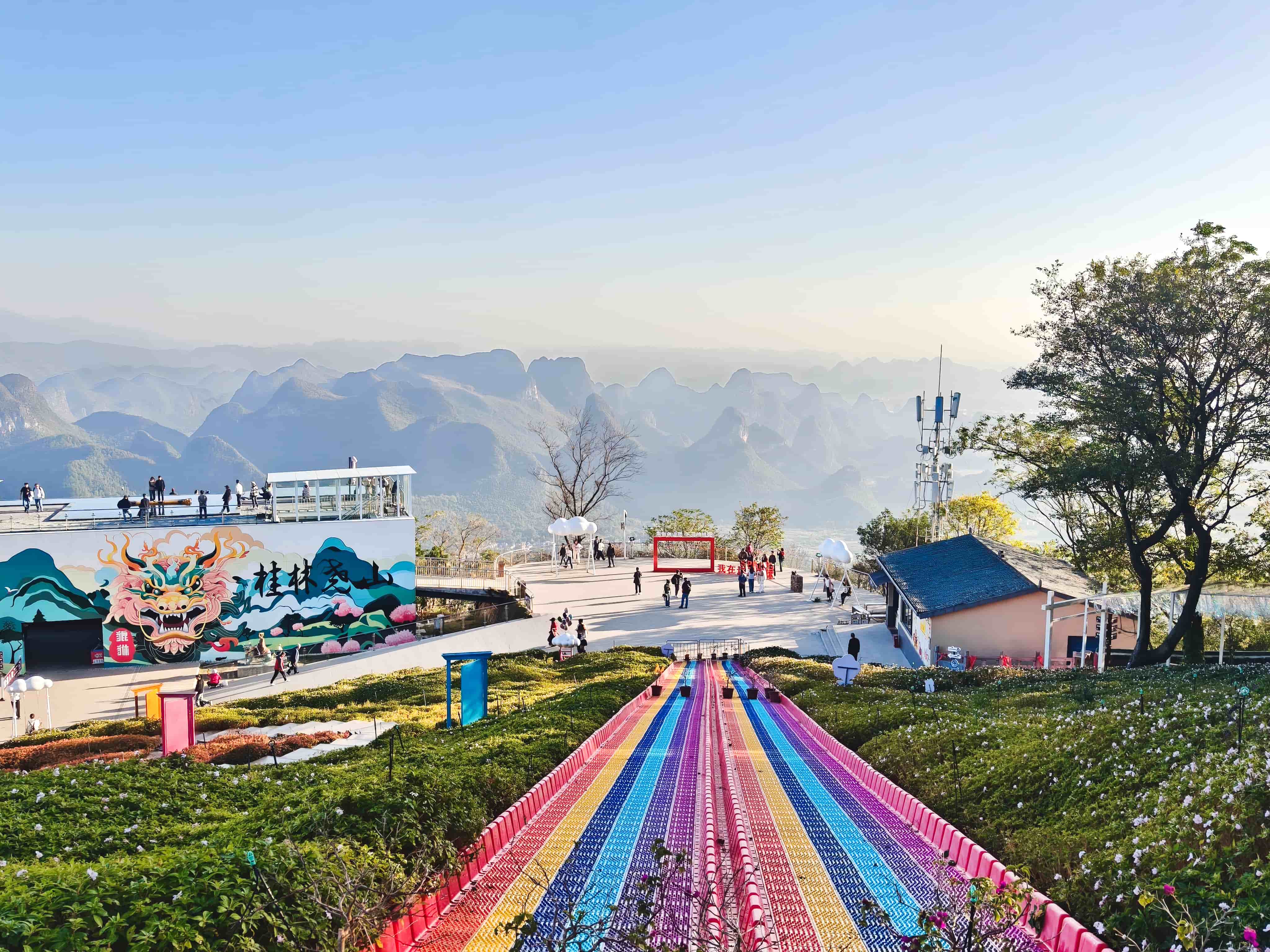 【堯山】是桂林東郊唯一較大的土山,也是桂林最高峰,可搭乘纜車觀賞桂林市景及灕江風光,極目四望,山前水田如鏡,村舍如在畫中,千峰環野綠,一水抱城流的桂林美景盡收眼底,峰海山濤,雲水煙雨的桂林山水就如同一個個盆景展現眼前。