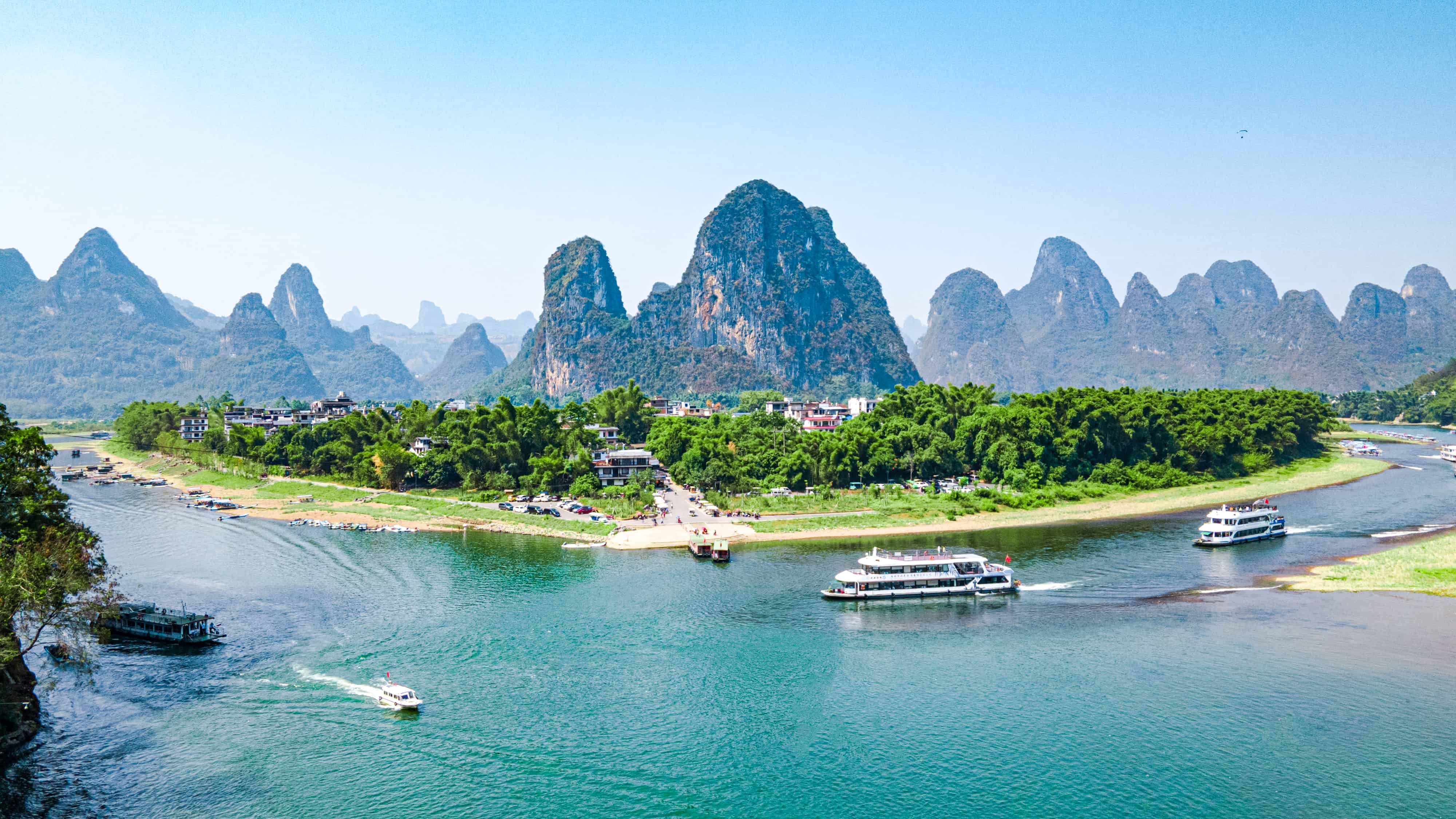 【船遊灕江】桂林和陽朔的山水風光是世界聞名的,搭乘灕江四星豪華遊船從竹江碼頭啟航,親身感受這兩地如仙境般的湖光山色絕景,灕江位於廣西壯族地區,從桂林市流向陽朔縣,因水質清澈和兩岸秀麗風光而聞名。
