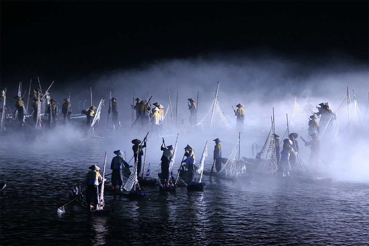 【印象劉三姐歌舞秀】以舉世聞名的桂林山水實景作為劇場,江面上可以隨意變化的中心舞台,以12座連綿起伏的山峰為背景,方圓近兩公里的灕江水域,打破了傳統演出在劇院有限空間進行的局限,堪稱是「人與上帝共同的創作」,江面上設置的兩個移動大螢幕,穿插播放電影《劉三姐》的經典場景和山歌,以此為主線,演出融合壯族風情、灕江漁火等元素創新組合,配以變幻莫測的燈光,創造出天人合一的境界。